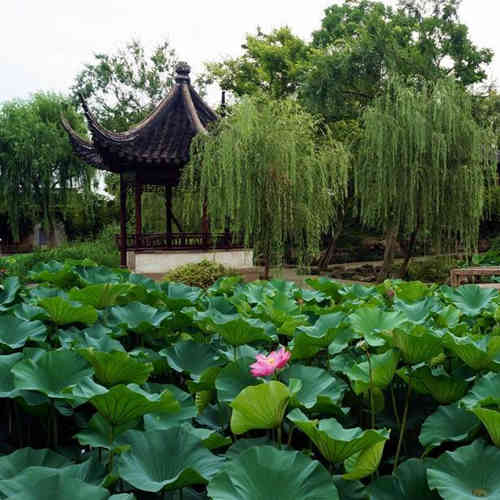 荷风四面亭,因荷而得,坐落在园中部池中小岛,四面皆水,莲花亭亭净植,岸边柳枝婆娑。亭单檐六角,四面通透,亭中有抱柱联:“四壁荷花三面柳,半潭秋水一房山。”春柳轻,夏荷艳,秋水明,冬山静,荷风四面亭不仅最宜夏暑,而且四季皆宜。