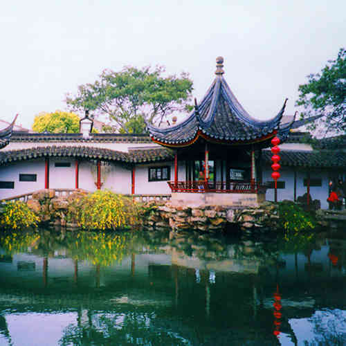 亭在园内彩霞池西,六角攒尖型,三面环水,亭心直径3.5米,高5米余,戗角高翘,黛瓦覆盖,青砖宝顶,线条流畅。取宋人邵雍诗句“月到天心处,风来水面时”之意,故名。内设“鹅颈靠”,供人坐憩,是临风赏月之佳处。