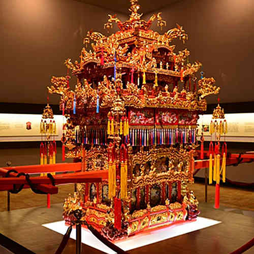 万工轿,就是要花万道工序才能制作成一顶轿。这顶高贵华丽的花轿高3米,长1.5米,宽95厘米,重约200公斤,由8人肩抬,另有8人轮换。其上饰有精雕妆金故事人物等,轿顶中央雕饰重重迭迭的金彩楼台亭阁。