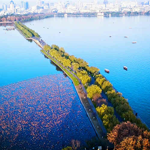 苏堤南起南屏山麓,北到栖霞岭下,全长近三公里,是北宋大诗人苏东坡任杭州知州时,疏浚西湖,利用挖出的葑泥构筑而成。后人为了纪念苏东坡治理西湖的功绩将她命名为苏堤。长堤卧波,连接了南山北山,给西湖增添了一道妩媚的风景线。