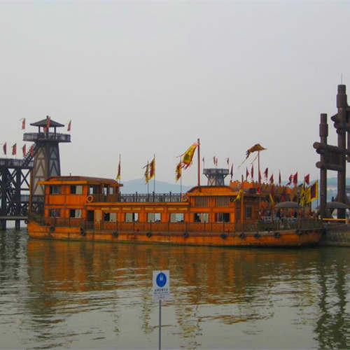 楼船位于曹营水寨内,伸入湖中。这条船的底层是曹操议事厅,曹操议事、宴请宾客的地方;二楼则是曹操的书房,正中一个篆体的“曹”字,桌上放的是曹操发号施令用的令牌,左侧的木板上刻有曹操这首著名的《短歌行》。