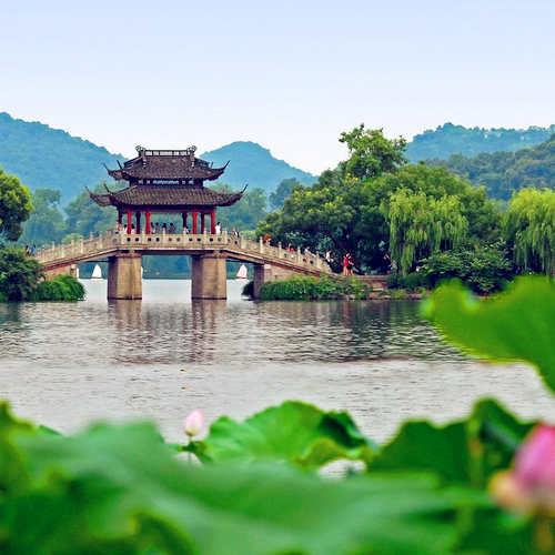 苏堤上连接曲院风荷的是金沙堤;堤上筑有用于疏导湖水的桥,贯通岳湖和西里湖,这座桥形状像玉带上的带环,故名叫玉带桥。天气晴朗无风的时候,整个桥身倒映在湛蓝湖水中,仿佛是横贯空中的彩虹,所以起名叫玉带晴虹。