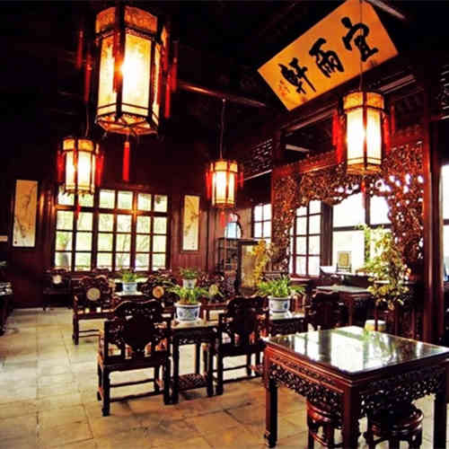 个园的四季园正中间为“宜雨轩”,东阔三楹,四面虚窗,可一览园中全景。轩的屋顶用扬州常见的黛瓦,四角微微上扬,东西两面墙上保留有几块建园时法国进口的花玻璃。宜雨轩是园主接待宾客的场所,轩前有对联:朝宜调琴暮宜鼓瑟,旧雨适至今雨初来。