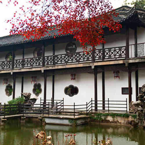 复道,就是在双面回廊的中间夹一道墙而形成,起到分流作用。走入西园首先看到的就是贯穿全园的复道回廊,全长1500多米,被誉为中国立交桥的雏形。回廊,扬州人俗称串楼,分上下两层,将东园、西园、住宅院落都串连在一起,廊东南两面墙上关有什锦洞窗和水磨漏窗。