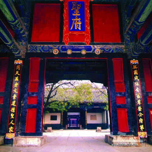 大门正中悬挂的“圣府”牌匾出自严嵩的手笔。对联:“与国咸休安富尊荣 公府第,同天并老文章道德 圣人家”,其中“富”字上面少一点,寓“富贵无顶”,“章”字一竖通到上面立字,寓“文章通天”,是清代才子纪晓岚手书。