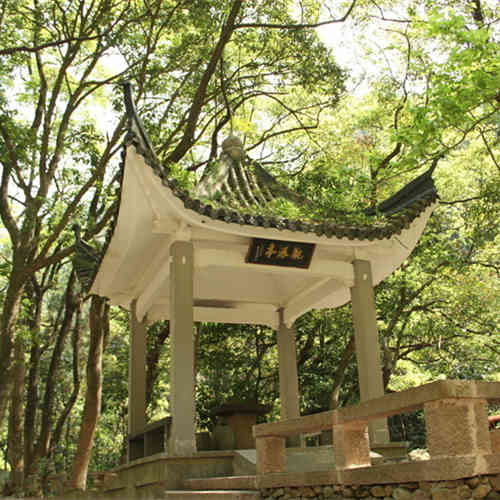 黄山观瀑亭是一座六方翘角,顶覆绿色琉璃的小亭子,中间摆有一张石桌和四个石凳,坐在这里,可以远观黄山三大名瀑之一的“百丈泉”,由此看百丈泉,只见清潭,紫云二峰有飞泉倾泄,势如银河天降。