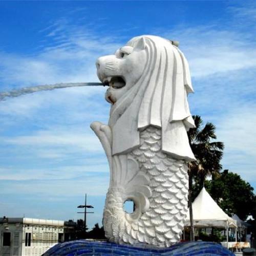 鱼尾狮是新加坡国家标志,如今新加坡全岛经批准的鱼尾狮雕像共有七座,以滨海湾鱼尾狮公园的这座原型雕塑及一旁的小鱼尾狮雕像最为出名。原型雕像高8.6 米,重70 吨,口中源源不绝地喷出水柱。象征财源滚滚。