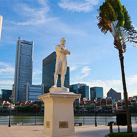 史丹福莱佛士爵士 (Sir Stamford Raffles)是现代新加坡的开埠者,一般相信这里就是莱佛士在 1819 年首次踏足新加坡之处,故称之为“莱佛士登陆遗址”。莱佛士雕像共有两尊,分别位于莱佛士登陆遗址 (Raffles Landing Site) 和皇后坊 (Empress Place)。这座矗立于新加坡河的白色人造石雕像交叉双臂,凝视大海,若有所思。不过这座雕像只是复制品。原有的莱佛士雕像是深铜色的,于 1969 年新加坡欢庆开埠 150 周年之际迁移至此。