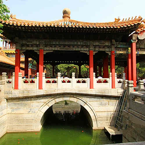 浮碧亭建于明万历十一年(1583年),前檐抱厦系于清雍正十年(1732年)所添建。池中水引自护城河,池壁雕有石蟠首出水口,池中芙蓉出水,游鱼穿泳,为御花园的景色增添了清新活泼的情趣。