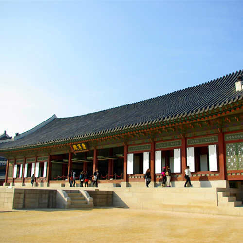 康宁殿是李朝国王的寝宫,“井”字格布局的房间中,国王使用中间的房间,内有十二间居室。左右两侧房间功用不同,右侧带床榻、灯盏、柜子和貌似痰盂的房间是寝室,左侧红靠垫、小红桌的地方时是用膳的房间,周围的房间由尚宫宿卫。与中国的宫殿相比,康宁殿非常朴素。