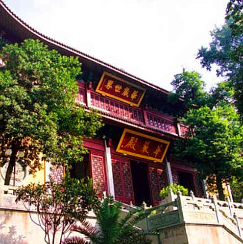 华严殿是灵隐寺的最高处,殿内供奉华严三圣,中间是毗卢遮那佛,是释迦牟尼经过修行后大彻大悟的保身佛形象来塑造的,体现佛祖从法身,报身到应身的三身变化,左右分别为文殊菩萨普贤菩萨,三尊佛像都用楠木雕成,工艺精湛是佛教艺术中的精品。