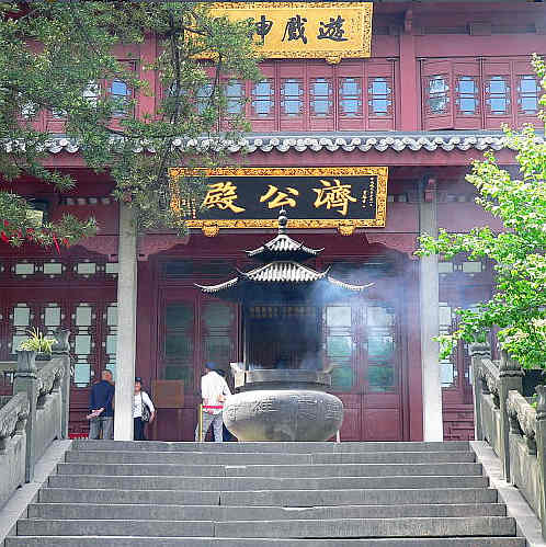 这里是全中国寺庙唯一的一座济公殿。济公原名李修远,浙江台州人,南宋初年在灵隐寺出家,老百姓尊称为济公活佛。现在的殿里墙上有18幅济公生平故事的壁画,连在一起足足有50米长,堪称绝世精品。