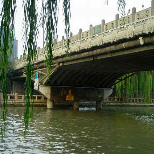 相传远古江海潮涨至此而得名。桥始建于北宋,元末毁,明宣德年间(1426―1435年)重建,为三孔石拱桥,成为运河船只终到杭州的标志。自古以来这里是辐辏之地,商贾云集之所。在宣德年间,僧觉微改为石弯桥,踩石级过桥,十分宏伟,光绪《湖墅小志》里称湖墅八景之一的“江桥暮雨”,即以江涨桥为背景,描述暮雨萧萧、入夜蟹火渔灯点点如繁星的景貌。